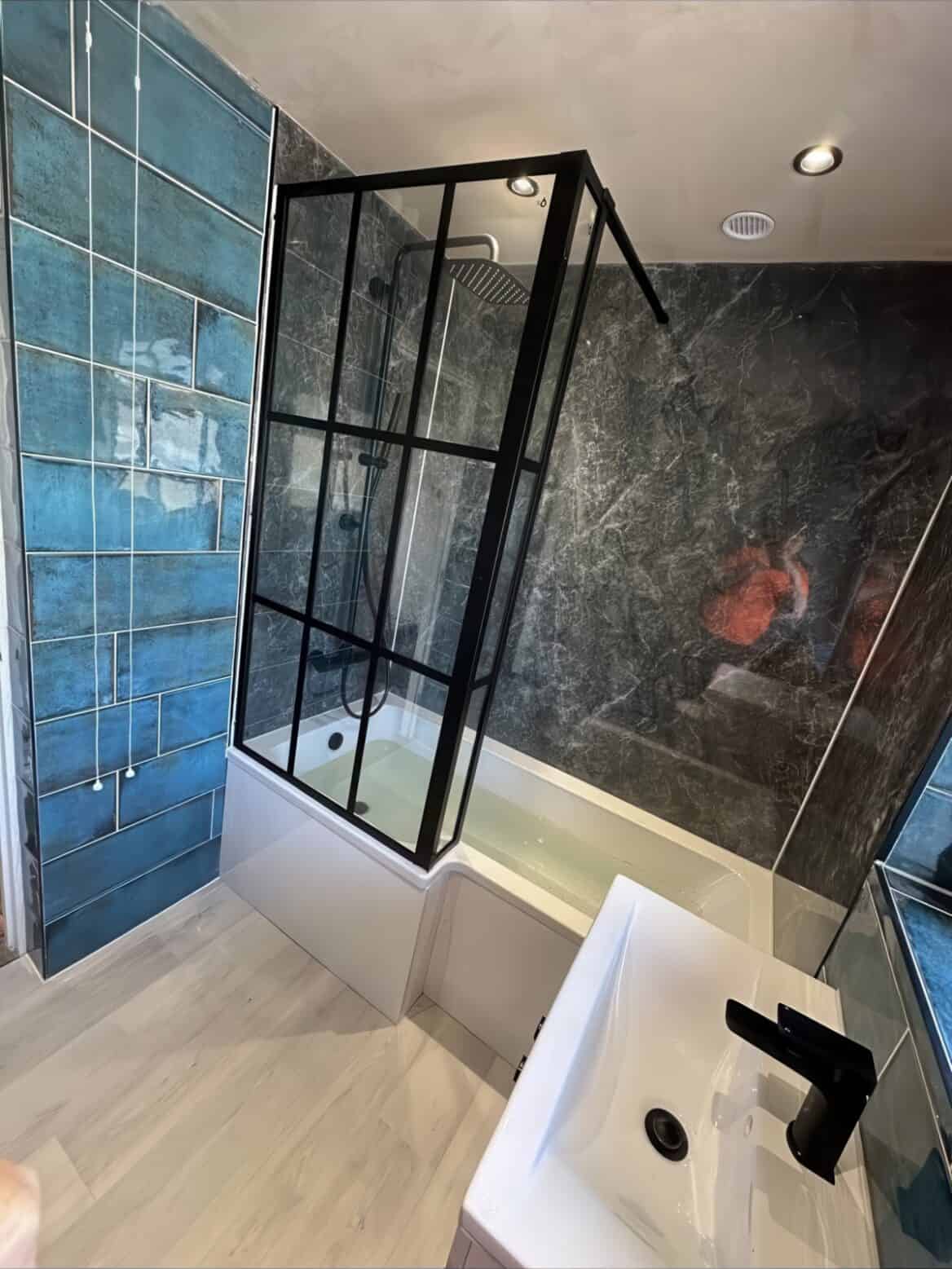 Clean white sanitaryware and a crisp vanity unit provide essential visual balance, preventing the bold colours from overwhelming. Pale wood-effect flooring grounds the design with warmth and natural texture. The result is a bathroom that feels both daringly unique and expertly crafted—proof that confident colour choices deliver extraordinary results.