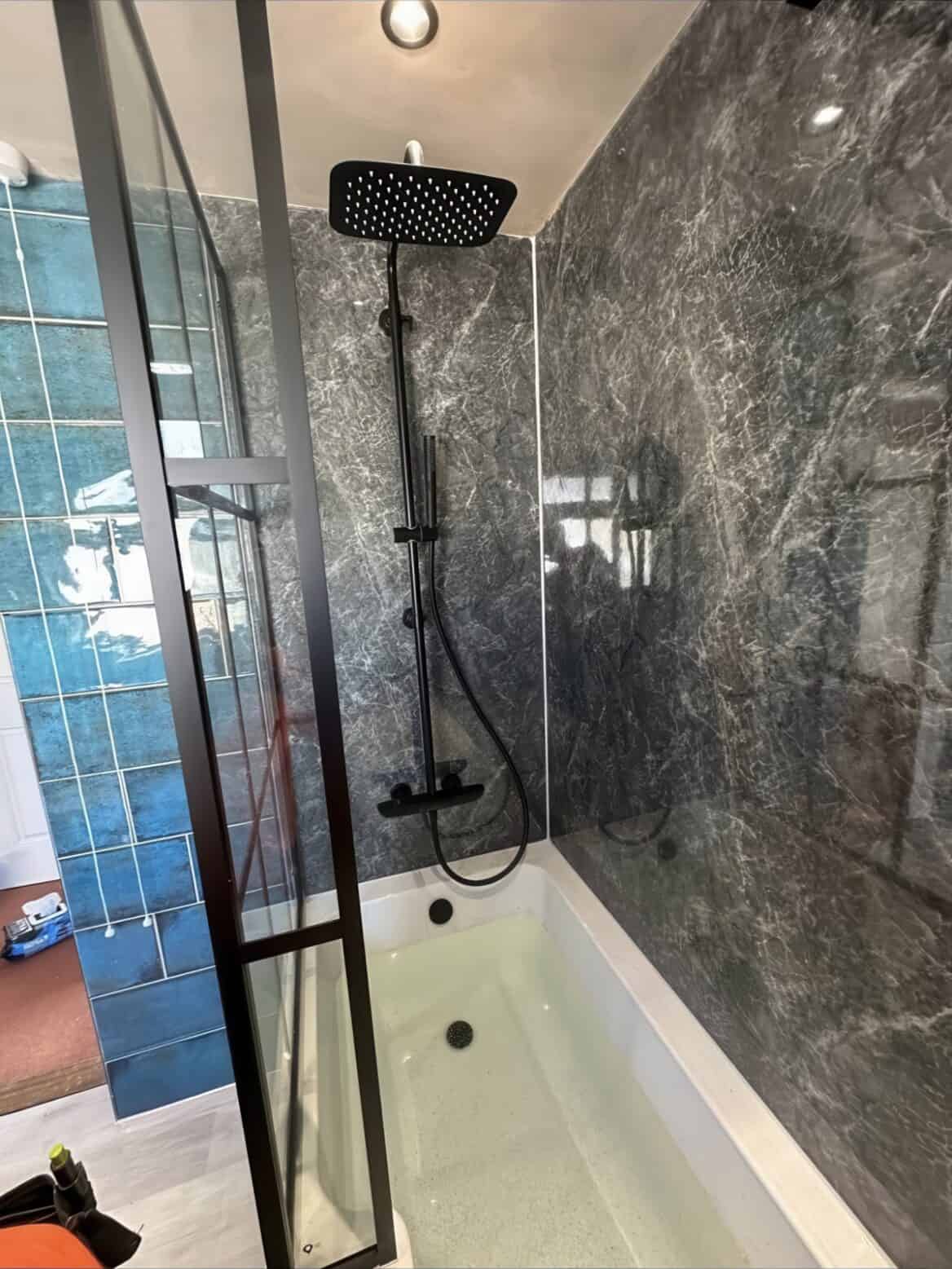 Contrasting beautifully, the shower area features dramatic dark marble-effect panels with silver veining, creating a luxurious focal point. The sleek black-framed shower screen adds industrial elegance, while matte black fixtures and a statement heated towel rail maintain the contemporary edge.