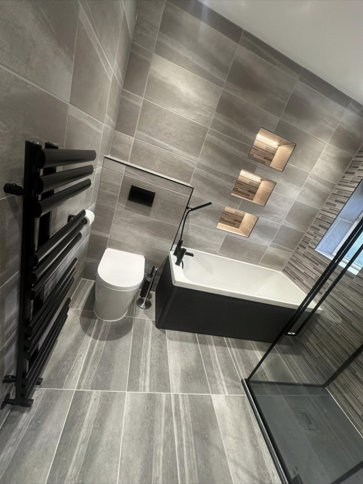 Sleek matte black elements provide bold contrast throughout—from the designer heated towel rail and black-framed shower screen to the stunning fluted vanity unit with its elegant ribbed detailing. Strategic LED lighting within recessed niches adds depth and ambient glow, highlighting the textural qualities of the wall tiles.
